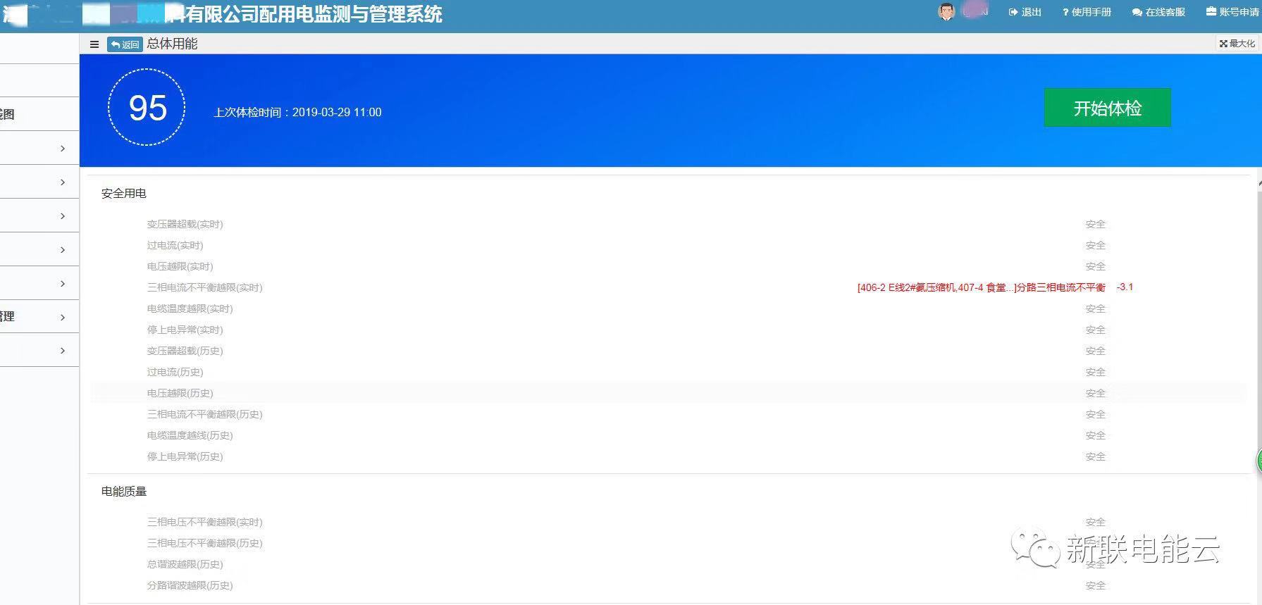 某饮料有限公司:我们使用用电体检,在扣分项中检查出1#变压器低压总和部分分路存在三相电流不平衡情况(三相电流不平衡的主要危害是造成零线电流增大,会导致电缆烧毁引起重大的安全事故),通过使用体检功能中的留言功能与新联专家在线实时沟通指导。根据建议将部分单相电设备进行调整,使三相电流基本平衡,公司比较关注用电安全情况,现在这种情况已基本不再出现了。