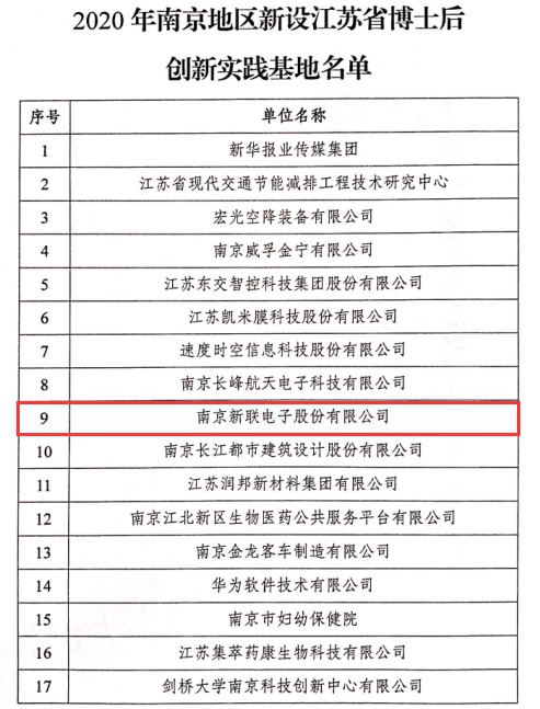 日前,江苏省人力资源和社会保障厅发布通知(苏人社函[2020]374号),南京地区共有17家单位获批设立江苏省博士后创新实践基地,南京新联电子股份有限公司名列其中。此次设立省级博士后创新实践基地,将为新联电子推进自主创新、加强校企合作、引进和培养高层次人才,提供重要人才平台和创新平台。