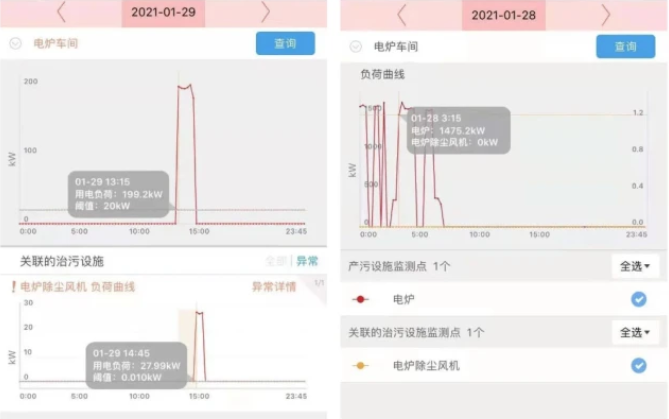 2021年1月29日,苏州市用电工况监控系统发出预警,显示某有限公司废气治理设施用电量数天内连续低值,疑似未与生产设施同步运行。根据预警线索,昆山市生态环境局执法人员第一时间对该公司进行了现场检查。通过调取该企业1月27日-28日用电数据,查实1月27日夜间至1月28日凌晨,该企业熔铁电炉用电数据在1500kW以上,但配套的布袋除尘风机没有用电数据。昆山市生态环境局对该公司未采取集中收集处理等措施控制、减少粉尘和气态污染物排放的环境违法行为予以立案处罚。